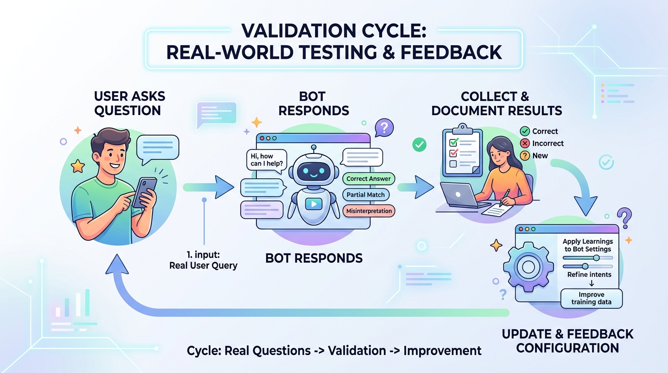 このレッスンでは、ボットが本番で活躍できるかどうかを確かめるために、「本番さながらの質問」を使ってテスト(=検証)する方法を学びます。料理でいうと、新しいレシピをお客様に出す前にまず自分で食べて味見をするのと同じです。ボットの「味見」をしっかり行い、検証結果をドキュメントにまとめるところまでを 15 分で仕上げましょう。