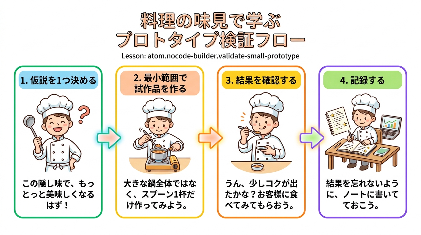 この Atom では、あなたのアイデアを「小さな試作品(プロトタイプ=本番前に作る簡易バージョン)」にして、本当に役に立つかどうかを確かめる力を身につけます。