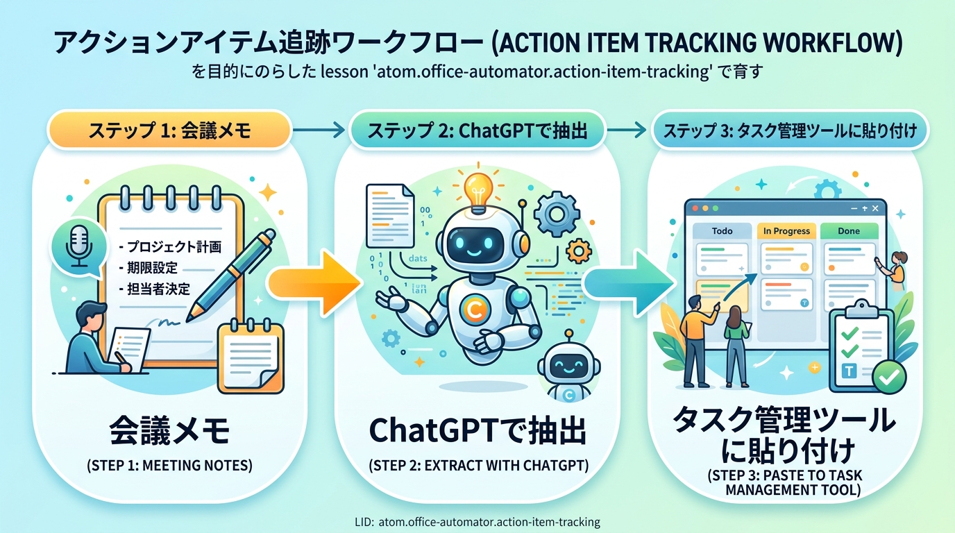 会議が終わったあと、「そういえば誰が何をやることになったっけ?」と迷った経験はありませんか?このレッスンを終えると、会議のメモをAIに渡すだけで、やるべきこと(アクションアイテム)をきれいにリストアップし、タスク管理ツールにまとめられるようになります。