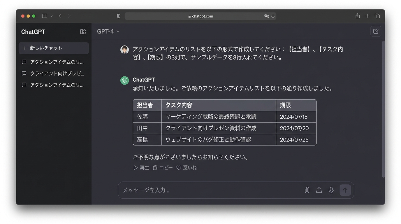 - AIにプロンプトを送ってアクションアイテムを抽出する — 表形式で整理された結果を受け取った