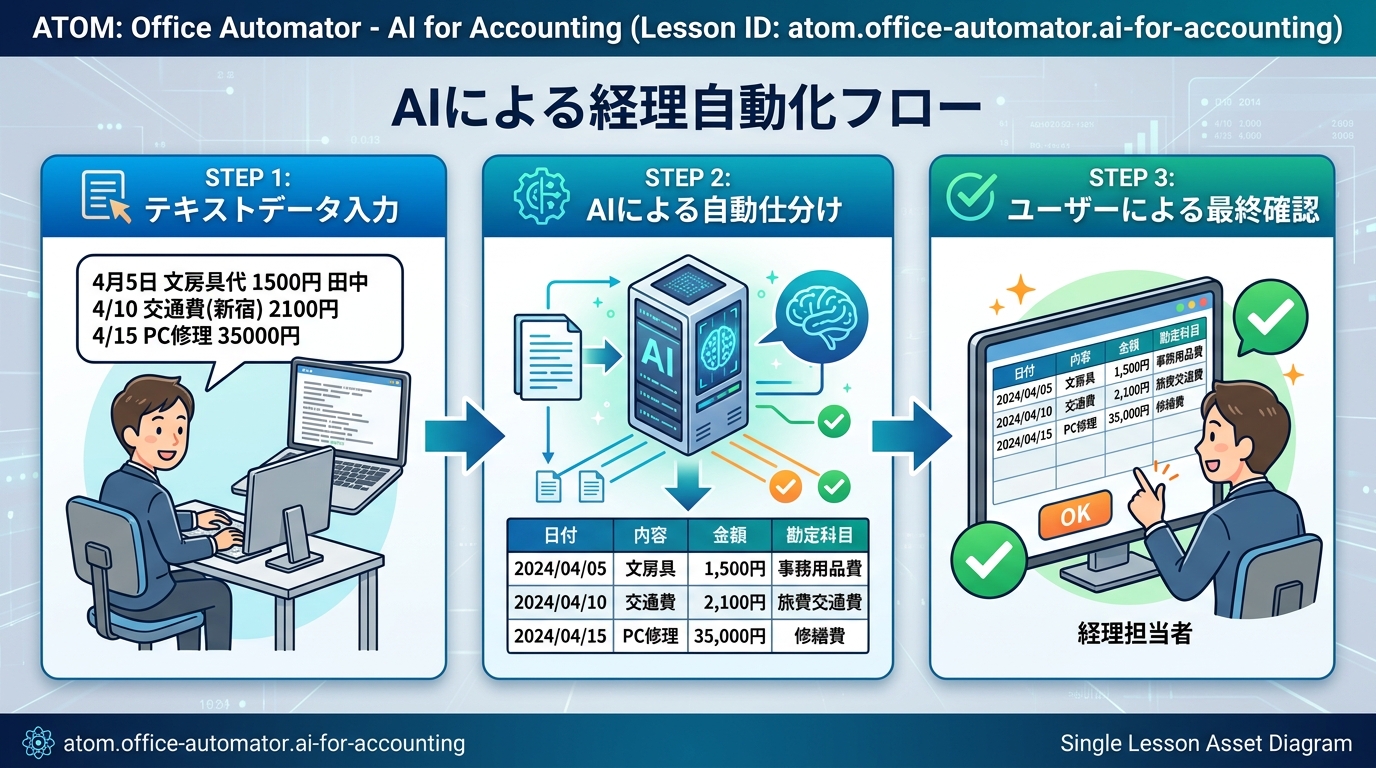 この Atom では、AIチャット(ChatGPT や Claude など)を使って、経理業務の中でも特に時間がかかる3つのパターンを実際に試します。最終的に「AIへの指示テンプレート」を1つ完成させて、明日からの業務で使える状態にします。