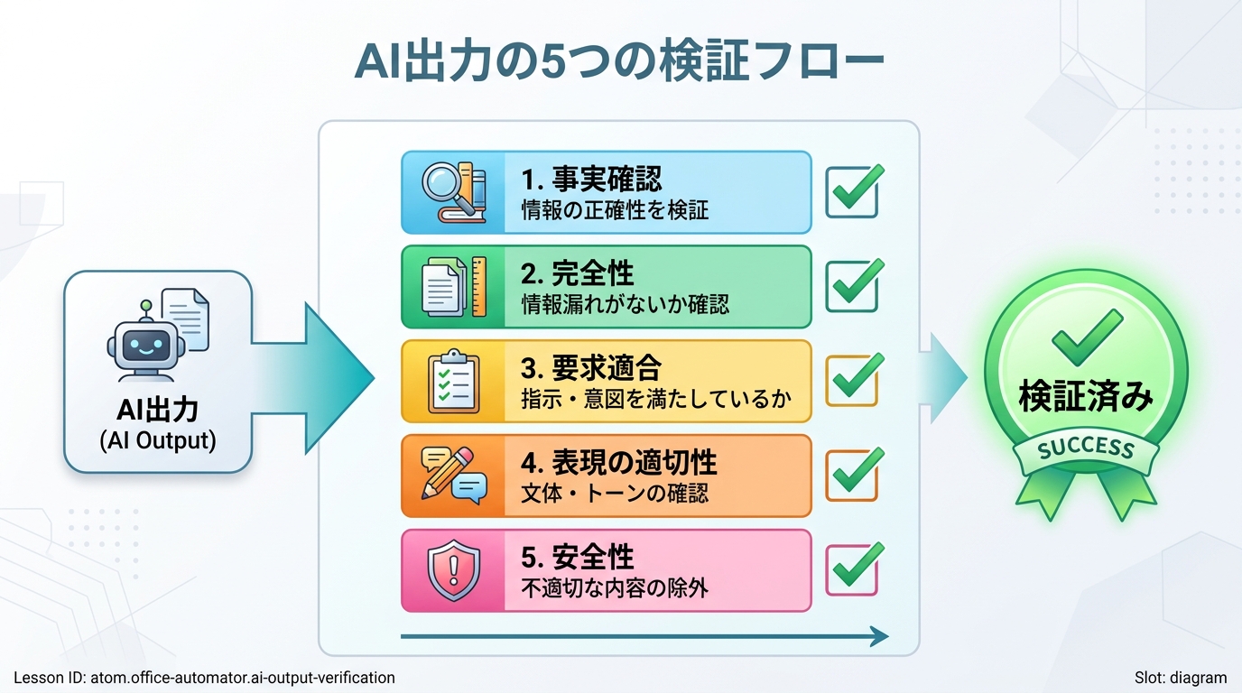 - AIの出力を5つの観点で体系的に検証する方法を理解した