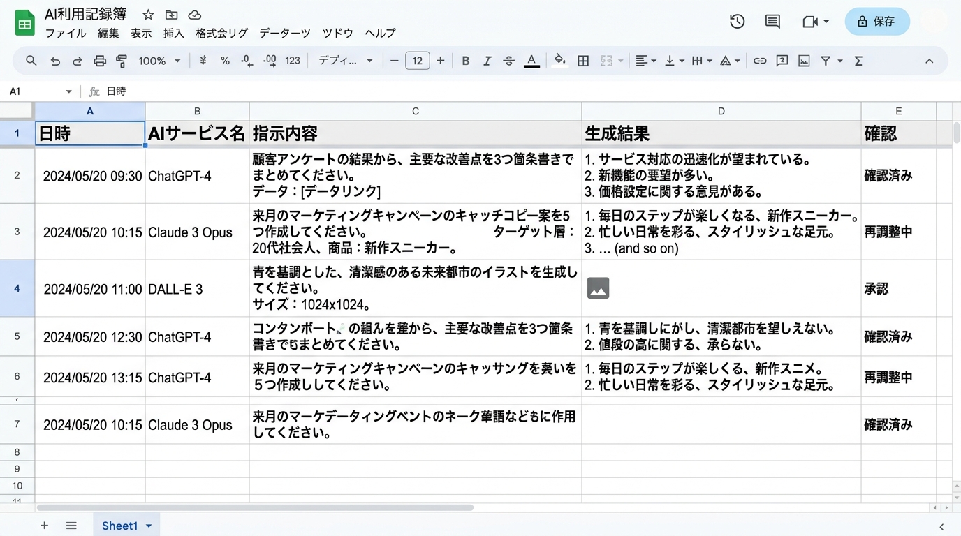 | プロンプトが長すぎてシートに収まらない | セル内で改行するか、「要約+元プロンプトへのリンク」にする。ChatGPTなら共有リンクを貼ると便利 |