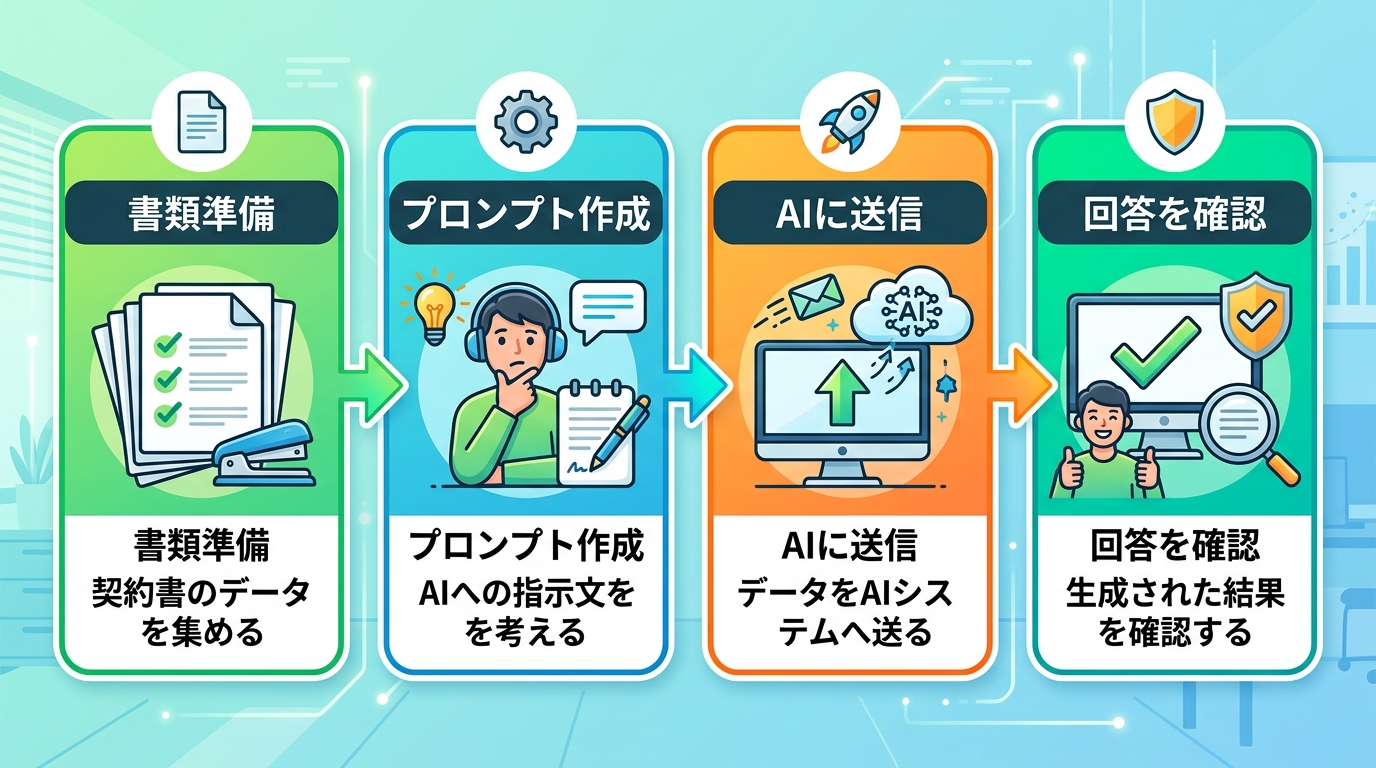 - AIに契約書または見積書のテキストを送り、チェックポイントの回答を受け取った