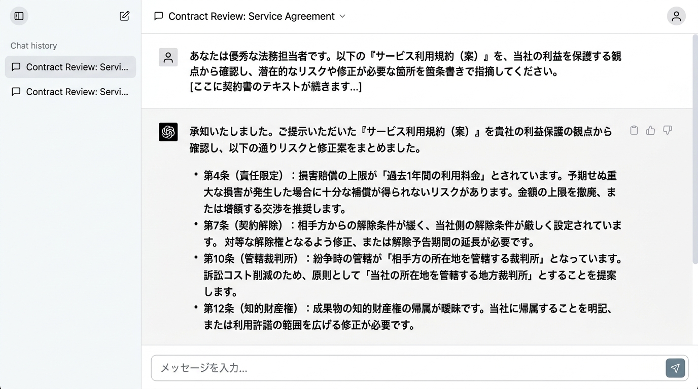 | ❌ 悪い例 | 「この契約書をチェックして」 | 曖昧すぎて、的外れな回答になりやすい |