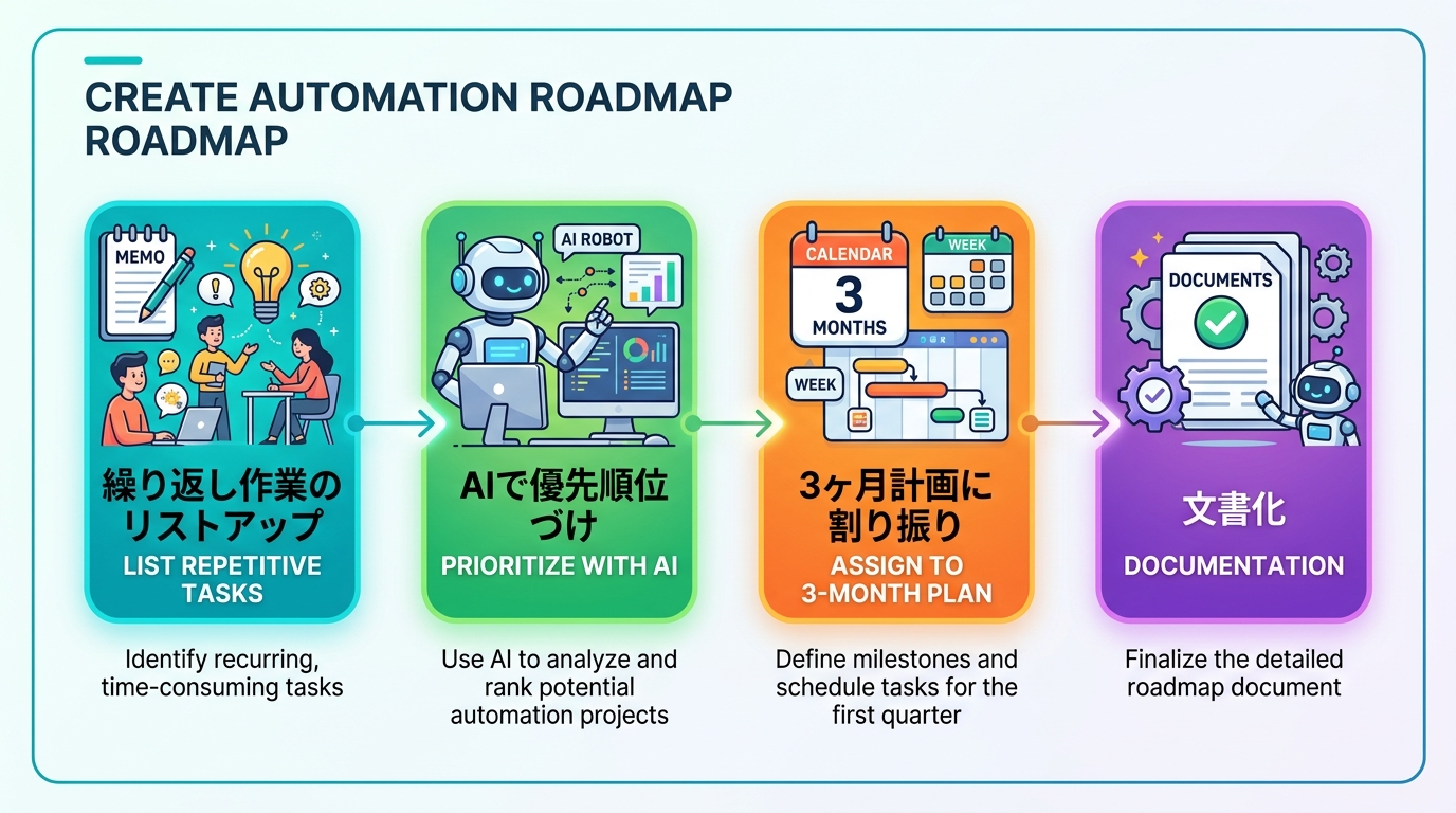 旅行の計画を立てるとき、最初は「行きたい場所」をざっとリストアップして、次に「何日目にどこへ行くか」を決めますよね。自動化ロードマップもまったく同じ手順です。まず「自動化できそうな作業」をリストにして、それを3ヶ月のスケジュールに割り振るだけです。