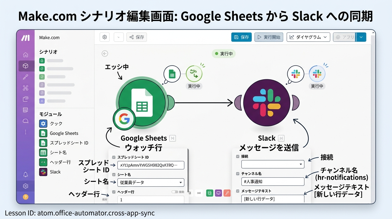 - AIに相談しながら Make.com で基本的な同期フローを組み立てられる