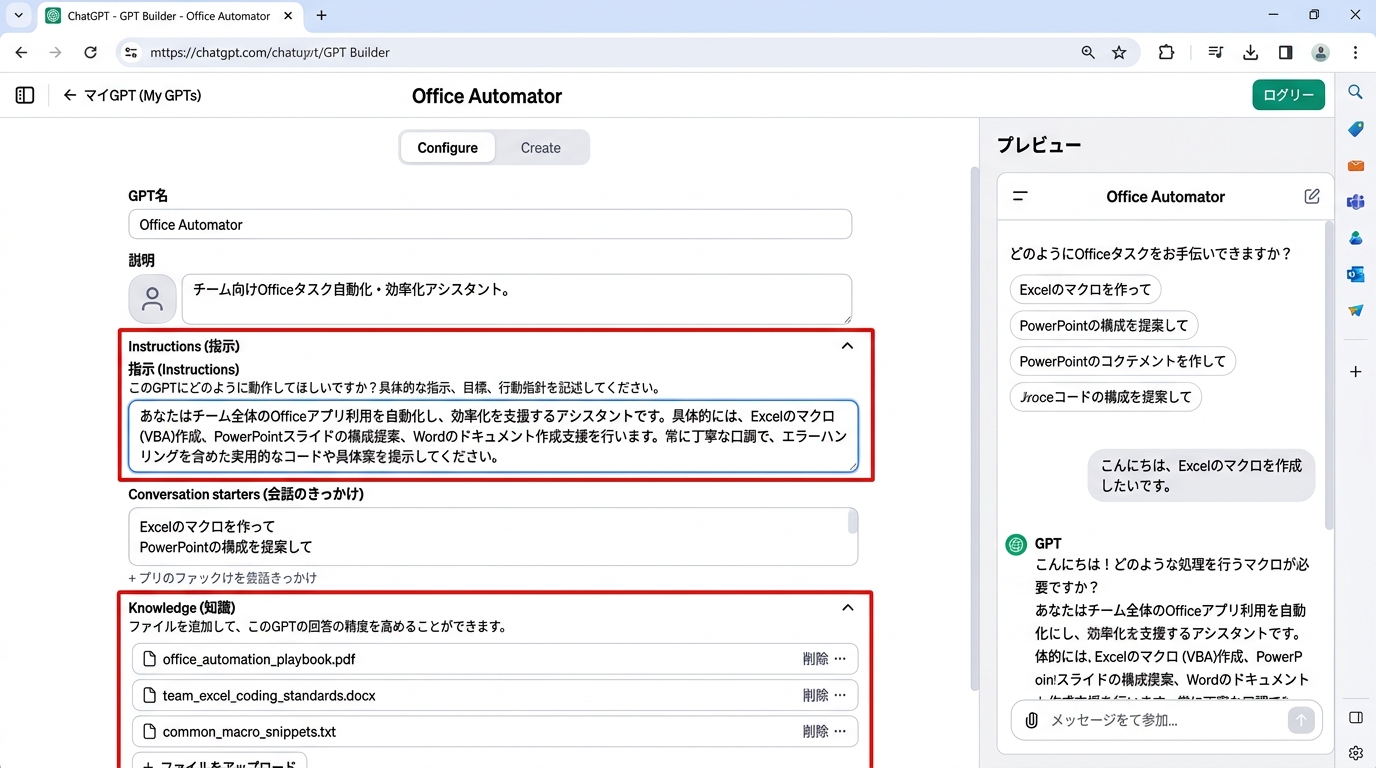 > **AI にプロンプトを考えてもらうコツ:** 上のテンプレートの【 】を埋めるのが難しければ、通常の ChatGPT に「私は○○会社の△△部で働いています。主な業務は□□です。この情報をもとに、カスタム GPT 用の Instructions を書いてください」と頼むと、たたき台を作ってもらえます。