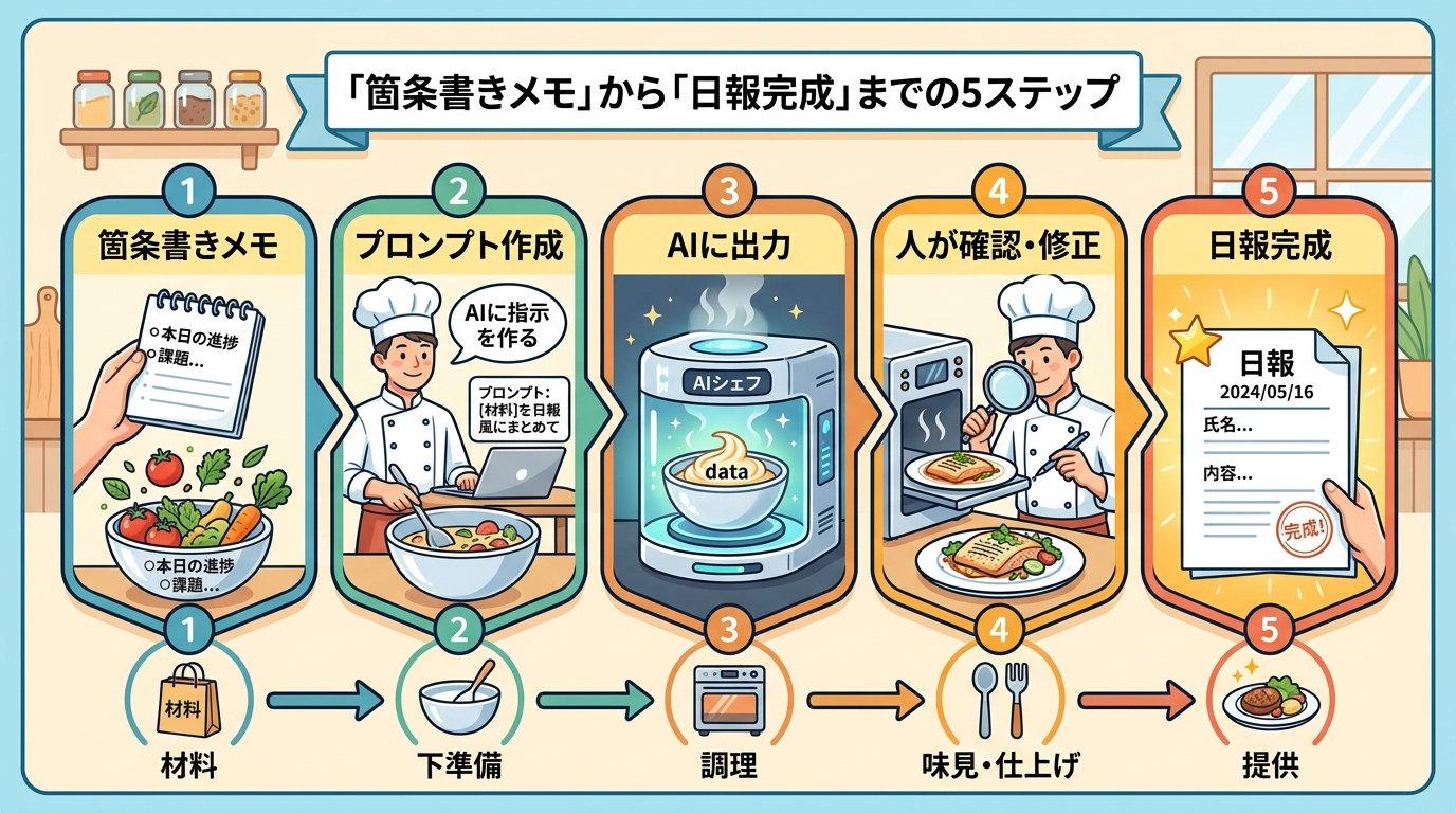 ポイント: メモは完璧でなくてOKです。「何をやったか」が箇条書きになっていれば、AIがきちんとした文章に整えてくれます。