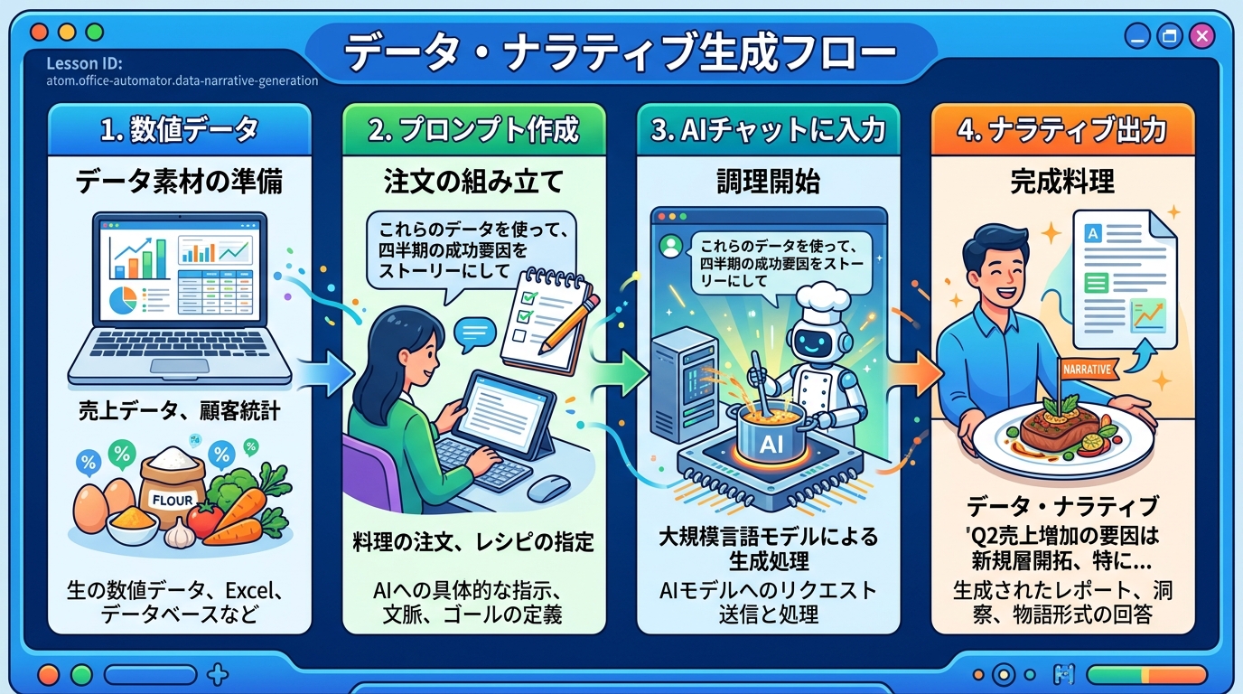 料理に例えると、数値データは「素材」、AIは「腕のいい料理人」、そしてナラティブ(=数字の意味を言葉で説明した文章)は「完成した一皿」です。あなたが用意するのは素材と、料理人への注文(プロンプト=AIへの指示文)だけ。あとはAIが美味しい一皿に仕上げてくれます。