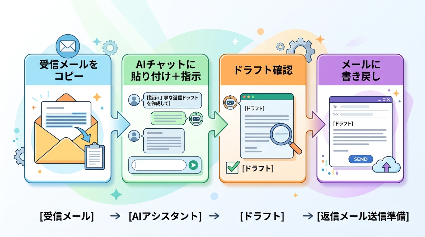 上の図のように、メールの返信作成は「コピー → AIに渡す → 確認・修正 → 送信」のたった4ステップです。