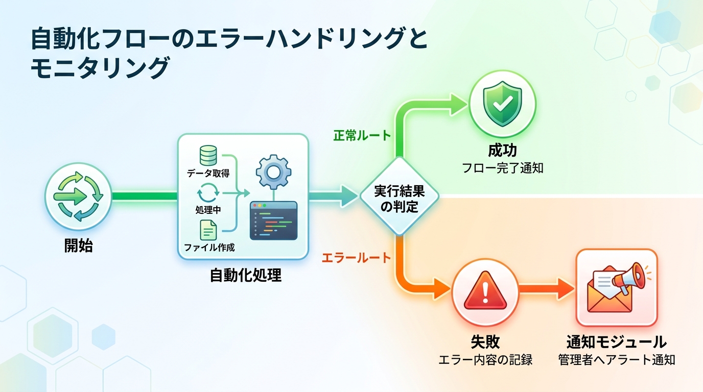 この図は、自動化フローが正常に動くルートと、エラーが起きたときに通知が飛ぶルートが分かれる様子を示しています。