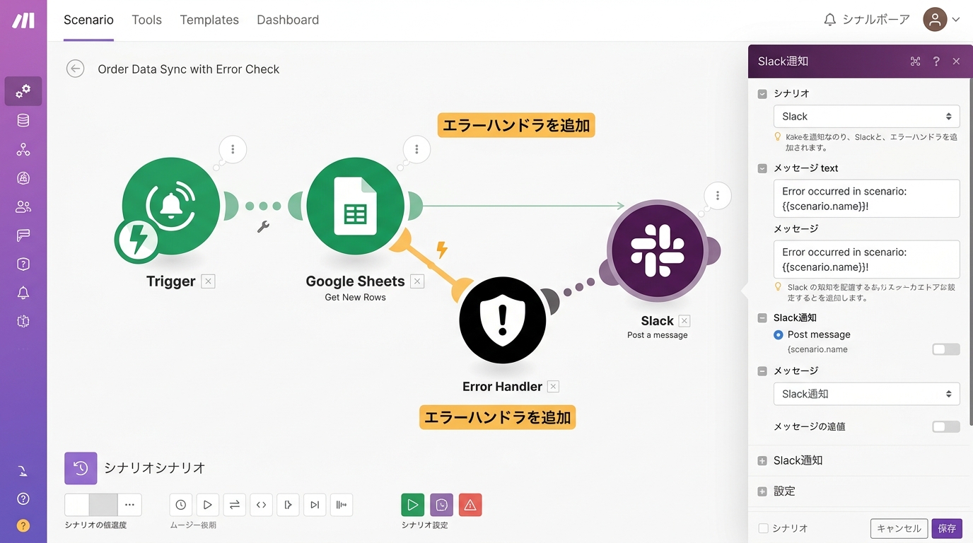 エラーハンドラー(=エラー発生時に自動的に実行される特別な処理)を設定します。ここでは Make を例に進めますが、Zapier や Power Automate でも考え方は同じです。