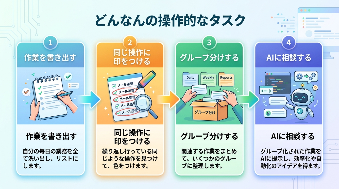 繰り返しパターンを見つけて分類する 毎日の仕事を振り返ってみましょう。メール返信、データ入力、報告書の作成……「これ、昨日もやったな」と感じる瞬間がありませんか? 料理にたとえると分かりやすいです。毎朝の味噌汁を作...