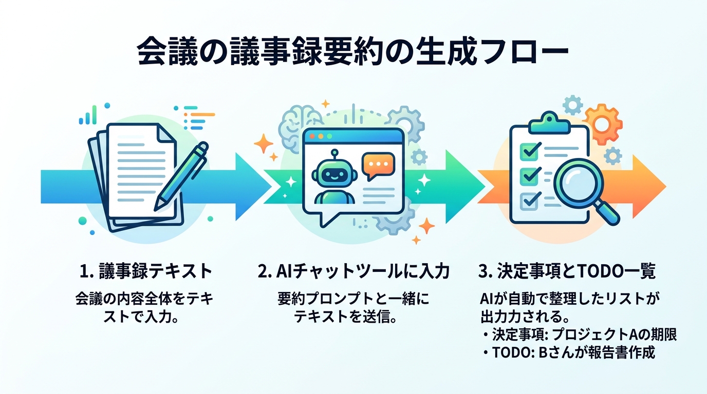 - 議事録テキストをAIチャットツールに貼り付けて、決定事項とTODOを自動で抽出できる