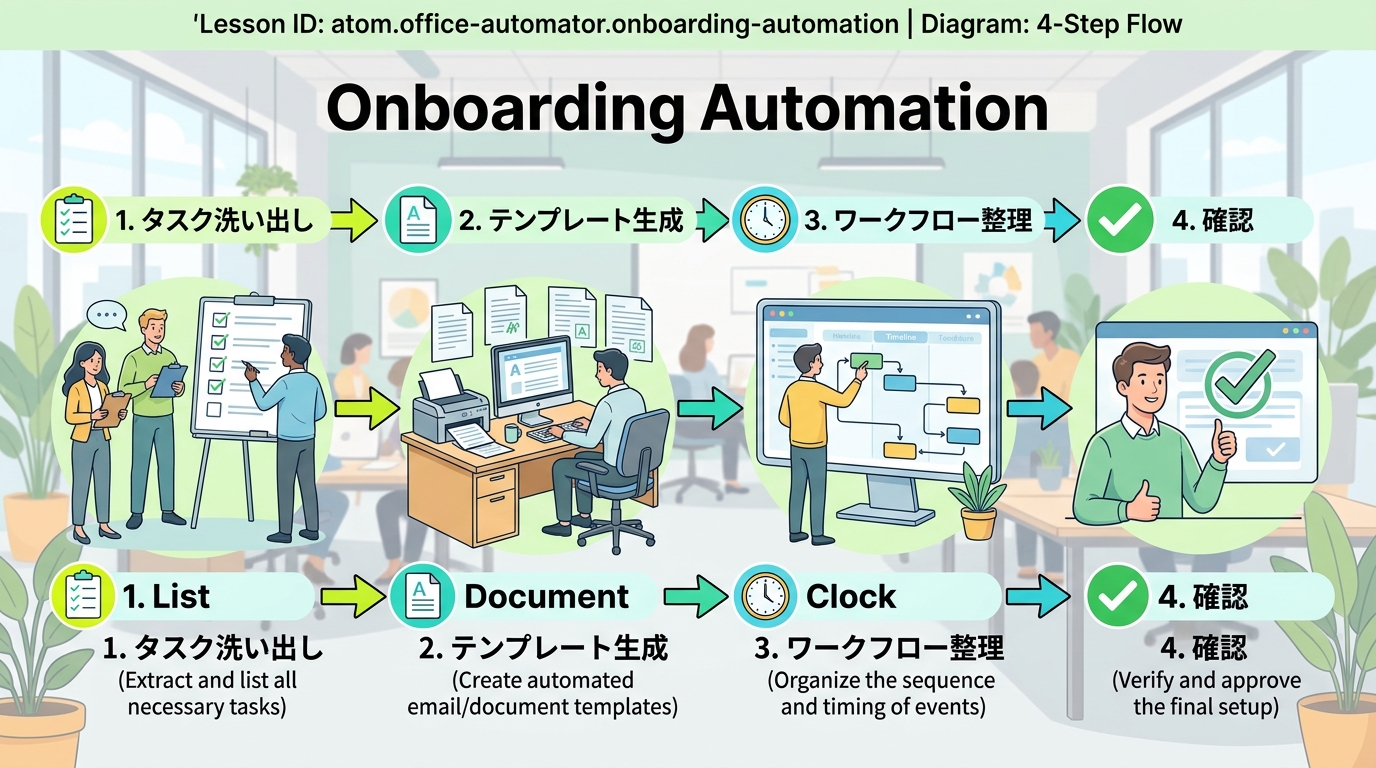 このレッスンでは、AIツール(=人工知能を使った便利なツール。ChatGPTやClaudeなど)を活用して、オンボーディング(=新入社員が職場に慣れるための準備期間)の準備作業を「次回からラクに回せる仕組み」にします。最終的に、あなた自身の手で オンボーディングワークフロー文書 を1本仕上げるのがゴールです。