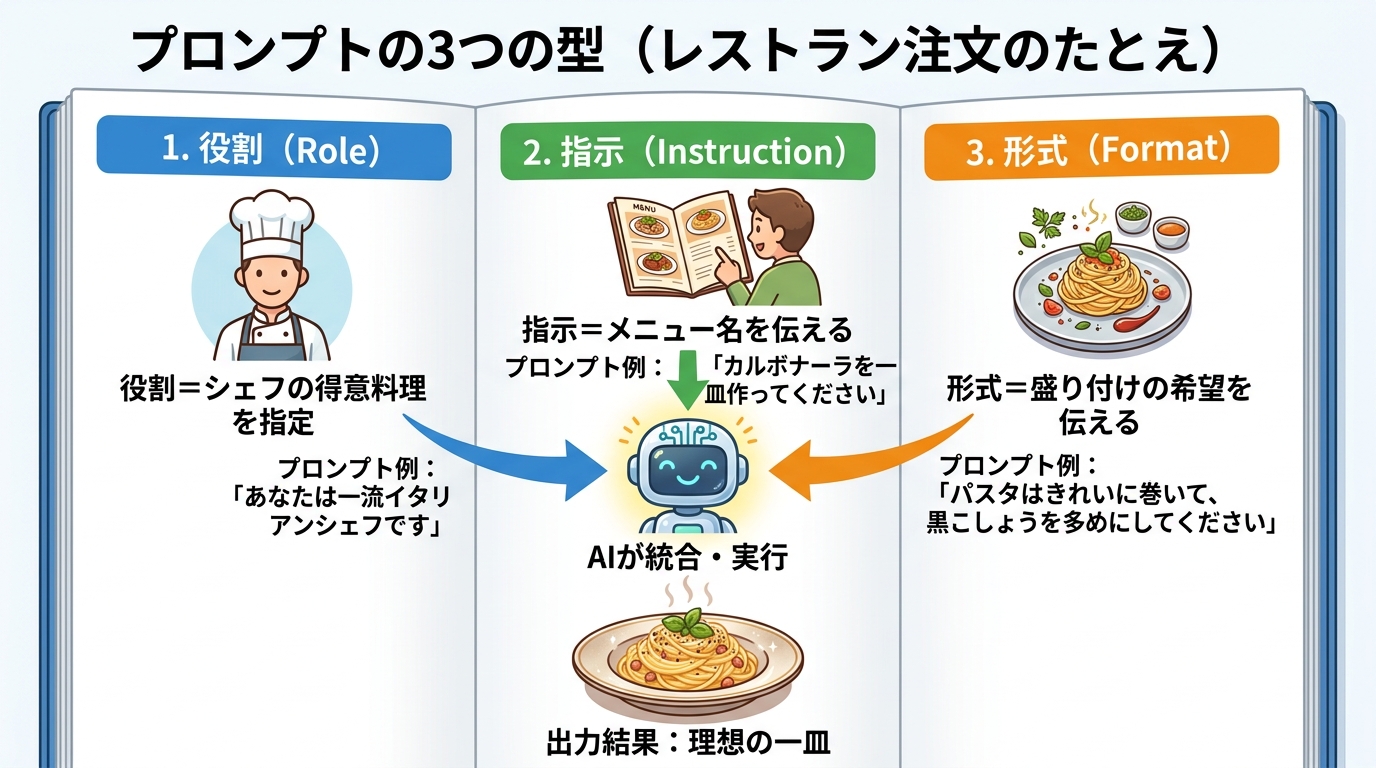 AIへの指示(プロンプト)の基本型を覚える レストランで料理を注文するときのことを思い出してください。「何かください」だけだと、店員さんは困ってしまいますよね。でも「温かいパスタを、トマトソースで、小盛りでお願いし...