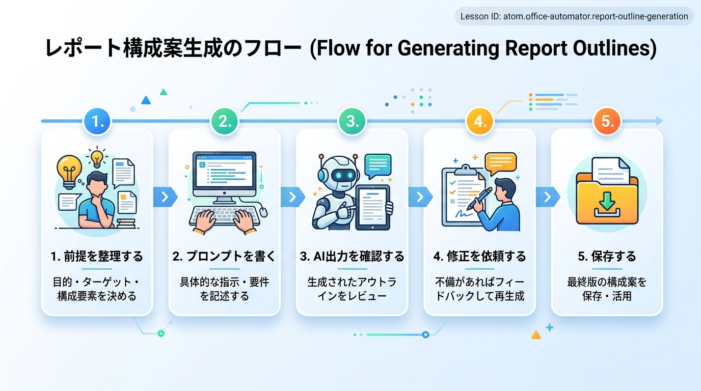 レポートの構成案をAIに作らせる レポートや企画書を書くとき、いきなり本文から書き始めると途中で迷子になりませんか? 料理にたとえると、カレーを作る前に「何人分か」「材料は何が必要か」をメモしておくのと同じで、レポ...
