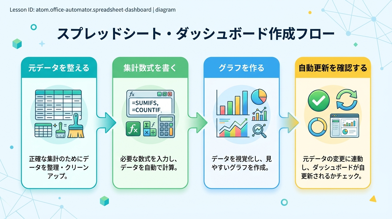 あなたは毎週、同じデータを手でグラフにまとめていませんか? それはまるで、毎朝コーヒーを淹れるたびにコーヒーメーカーの説明書を最初から読み直すようなものです。一度「自動で淹れる仕組み」をセットすれば、ボタンひとつで毎朝おいしいコーヒーが出てきます。スプレッドシートのダッシュボードも同じです。最初に仕組みを作れば、データが更新されるたびにグラフや集計が自動で変わります。