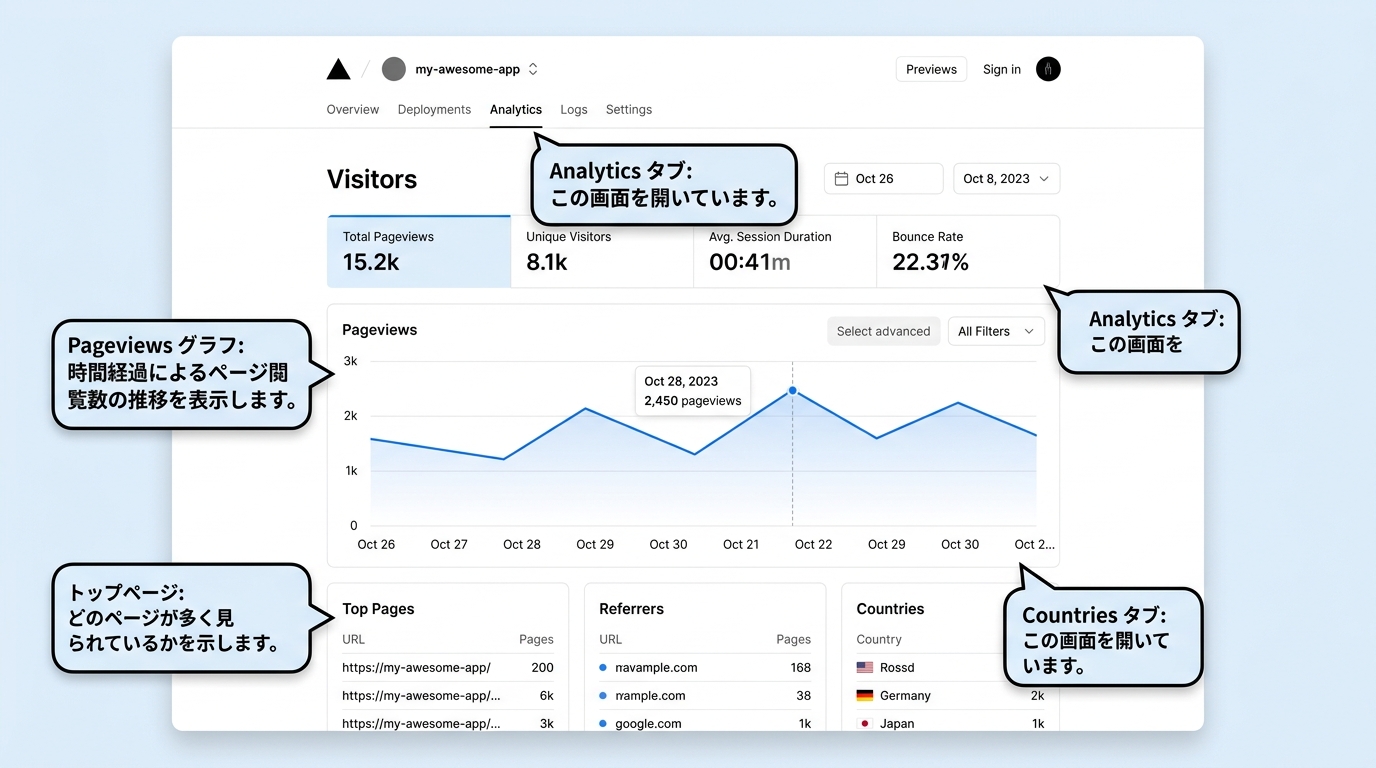 次は実際に何人かの訪問者を集めて、数字の変化を観察してみてください。「どのページがよく見られているか」「どこからの訪問者が多いか」など、Vercel Analyticsが見せてくれる情報は意外と面白いですよ。