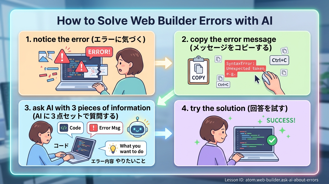 エラーが出たらAIに正しく聞く Webアプリを作っていると、急に画面が真っ白になったり、赤い文字がズラッと出たりします。そんなときは、AI(=あなたの質問に答えてくれる賢い助手)に助けを求めるのが一番の近道です。...