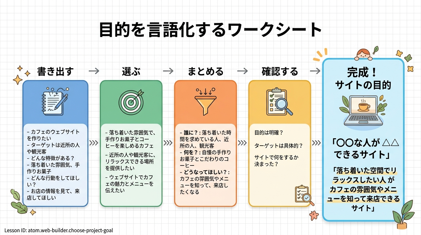 このレッスンでは、あなたが作りたいサイトの目的を 10分で1文にまとめる方法 を学びます。特別な知識は一切不要です。メモアプリ(またはノートとペン)だけ用意してください。