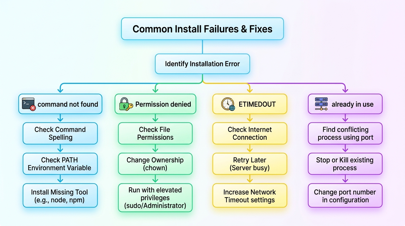 このレッスンでは、あなたのパソコンに開発ツール(=Webサイトを作るための道具)を入れるときに、よく起こる失敗を3つのパターンに分けて整理します。失敗を「こういうときはこう直す」というレシピに変えておけば、次に同じエラーが出ても落ち着いて対処できます。