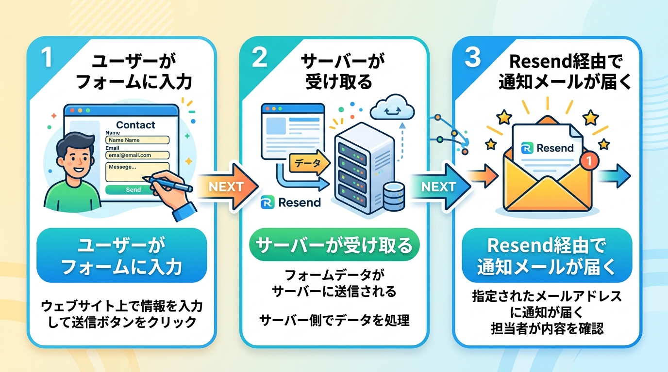 メール送信にはResend(=メール送信サービスのひとつ。無料プランで月100通まで送れる)を使います。