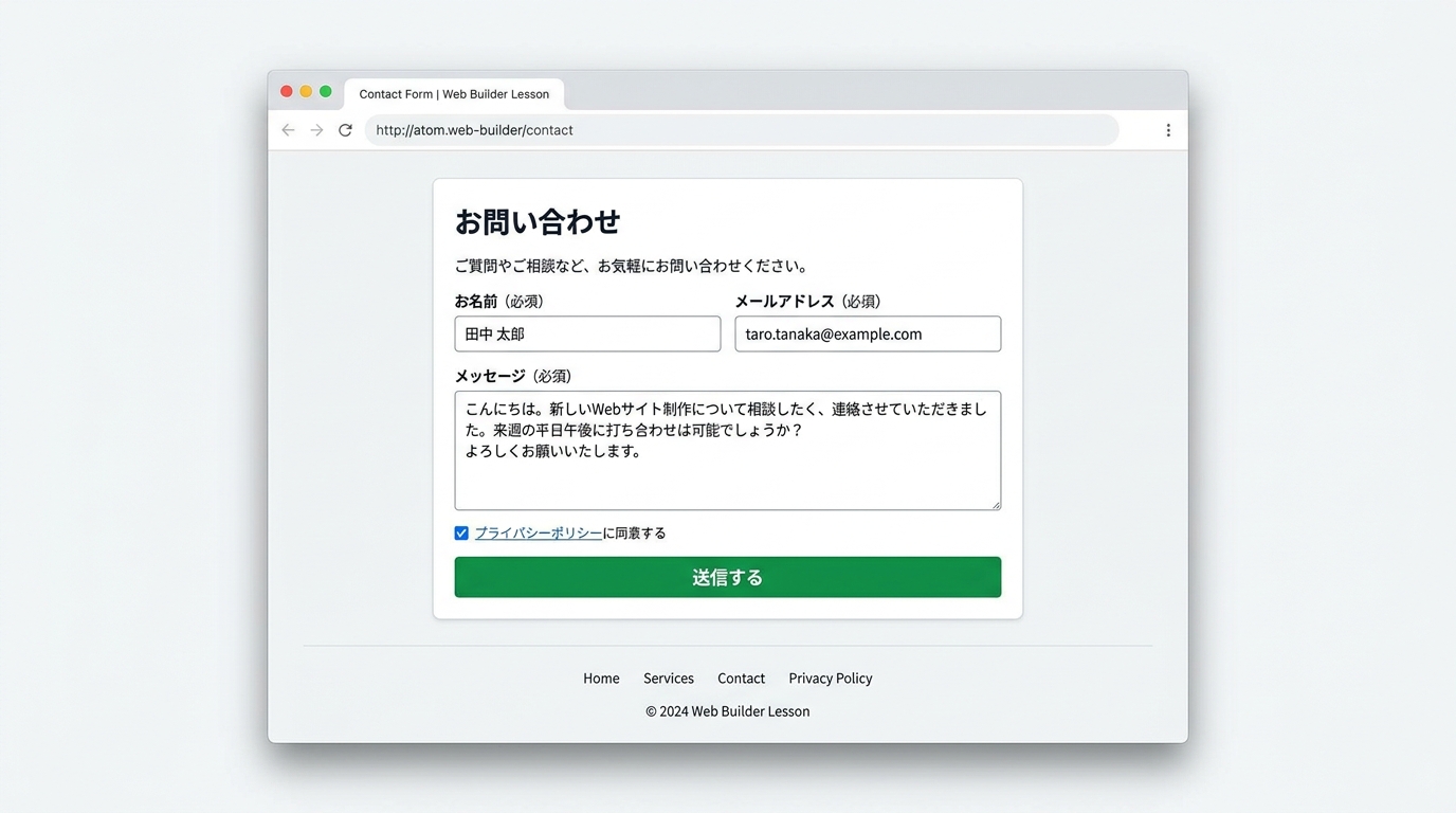 | 入力欄が表示されない | ファイルが正しいパスに保存されていない | AIに「app/contact/page.tsx が正しく配置されているか確認して」と聞く |