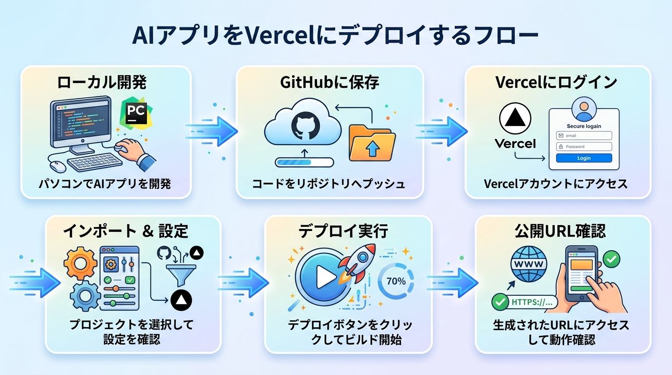 上の図が、これからやることの全体像です。大きく分けると ①ビルド確認 → ②Vercelアカウント作成 → ③プロジェクトをインポート → ④公開を確認 の4ステップです。