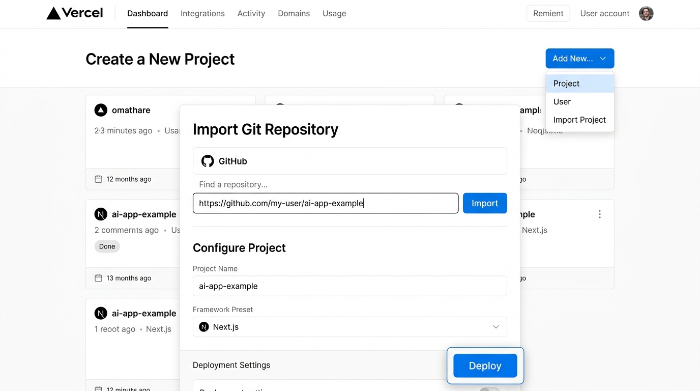 GitHubにコードが上がったら、Vercelに「このコードを公開して」と伝えます。