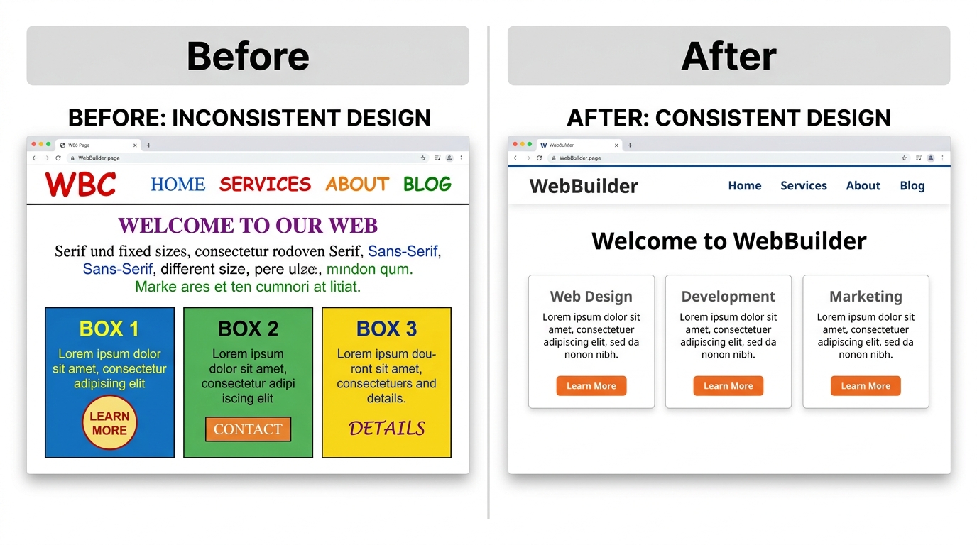 - 統一されたサイト — 全ページで色・文字サイズ・ボタン・余白が揃った状態