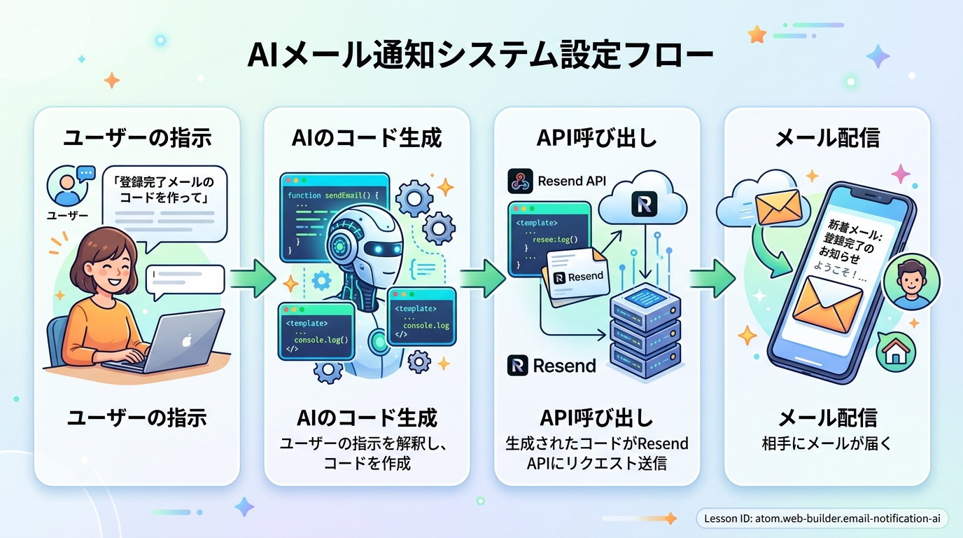 たとえるなら、お店に「郵便係」を一人雇うようなものです。お客さんがフォームを送信したら、郵便係が自動で手紙を書いて投函してくれる。このAtomでは、その「郵便係」をAIツールの力を借りて15分で作ります。