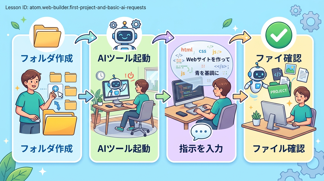 このレッスンでは、あなたのパソコン上に「プロジェクト(=作品をまとめるフォルダー)」を作り、AIに「こんなWebページを作って」と伝えて、実際にブラウザで表示するところまでを15分で体験します。終わったあとには「自分の指示でAIがページを作ってくれた!」という実感が残ります。