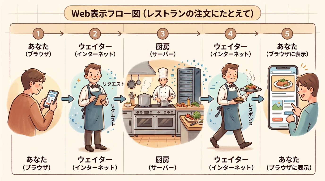 Webサイトが表示されるまでの流れを、レストランのたとえを使って
