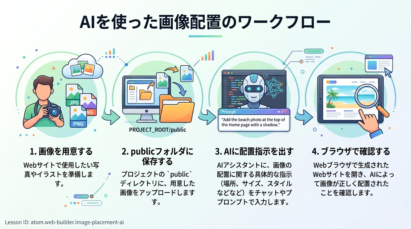 - 画像が巨大で表示が遅い: スマホで撮った写真はそのままだと重すぎます。AI に「この画像を Web 用に 1200px 幅に縮小する方法を教えて」と聞くか、無料の画像圧縮サイトを使います