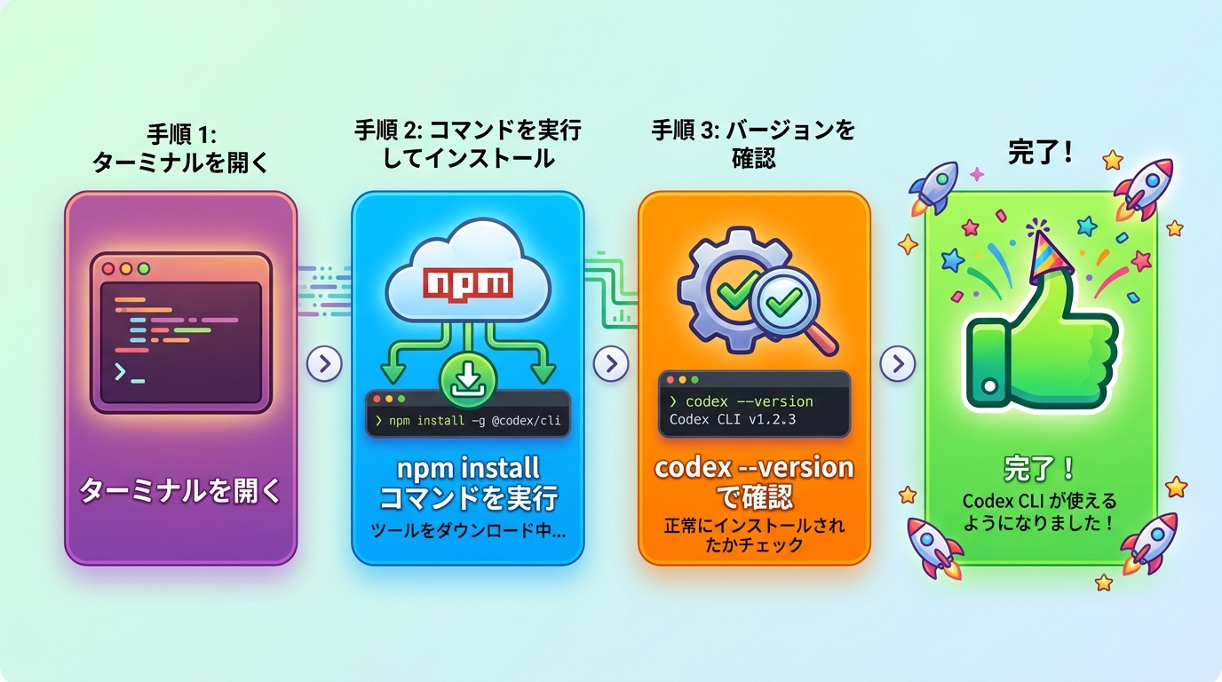 npm→ Node.js に付属するアプリ管理ツール(スマホの App Store のようなもの)install→ 「インストールして」-g→ 「パソコン全体で使えるように(global の略)」@openai/codex→ 「Codex CLI という道具を」