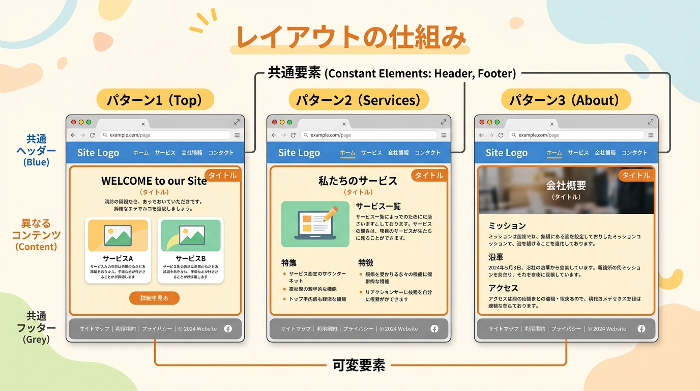 共通ヘッダー・フッター・ナビゲーションを作る レストランのメニュー表を想像してみてください。表紙にはお店のロゴ、裏表紙には住所と電話番号があって、中身のページだけが次々と変わりますよね。Webサイトもまったく同じ仕...