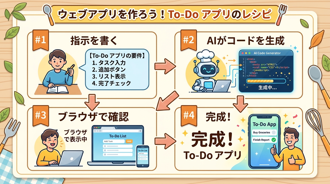 AIと一緒にToDoアプリを15分で作る 料理でいうと、これまで「卵の割り方」「フライパンの熱し方」を一つずつ練習してきましたよね。今回はそれら全部を組み合わせて、1品のオムライスを完成させる――そんな総仕上げの演...