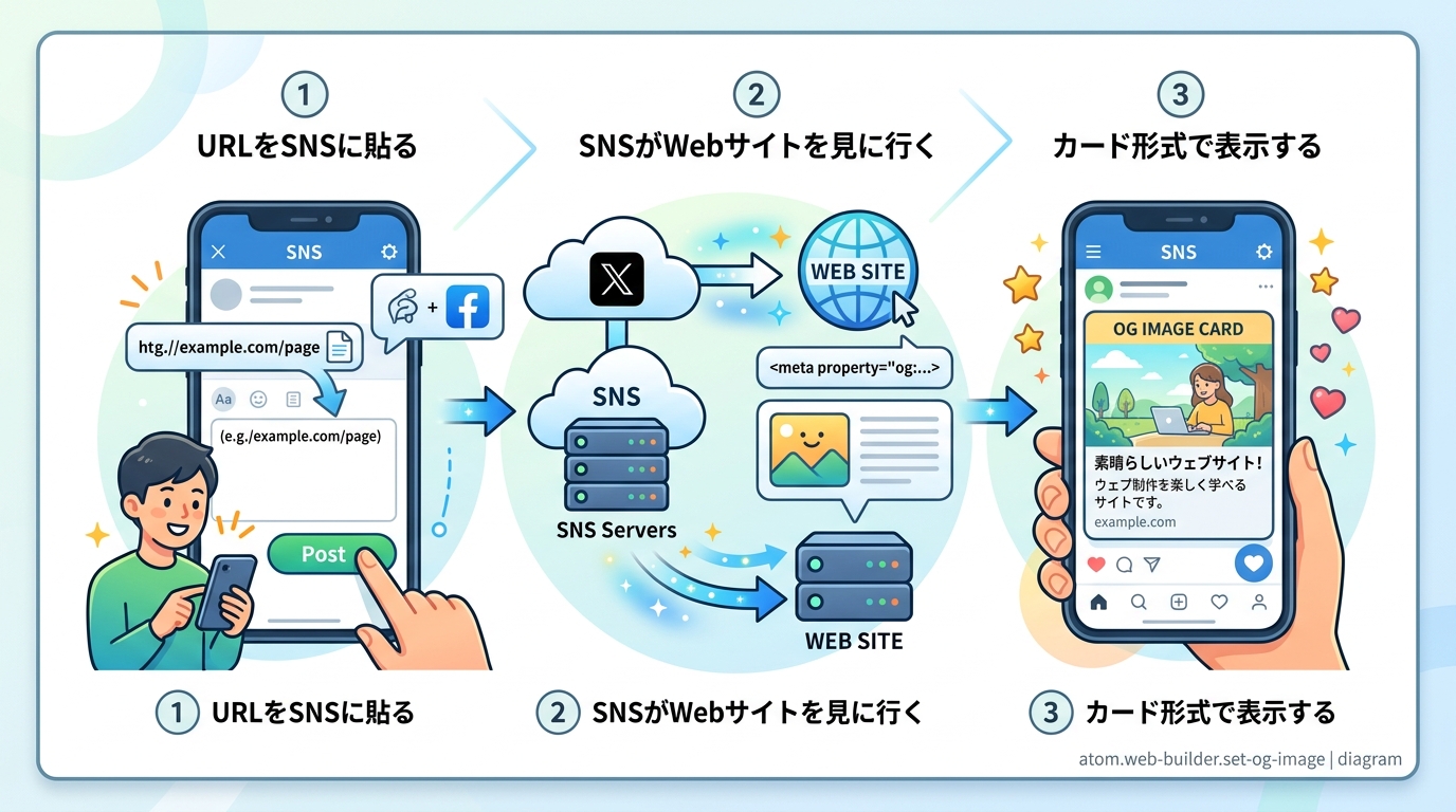たとえば、レストランの入り口には「何のお店か」がひと目でわかる看板がありますよね。OG画像(オープングラフがぞう=SNSでシェアしたときに自動で表示されるプレビュー画像)は、あなたのWebサイトにとっての看板です。看板がなければ、通りすがりの人はお店に入ろうとしません。同じように、OG画像がないURLは、SNSのタイムラインでスルーされがちです。