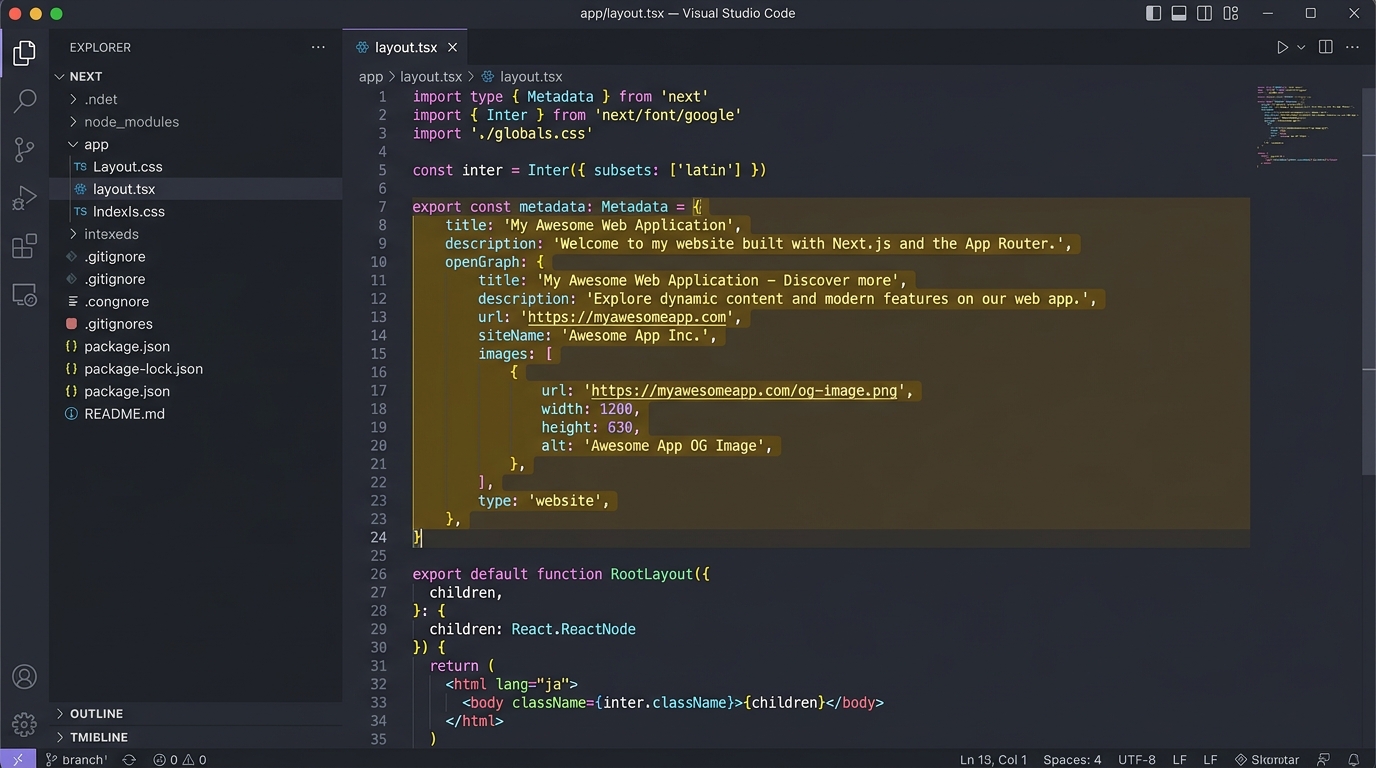 AIが export const metadata = { ... } という形のコードを返してくれます。これをあなたのプロジェクトの app/layout.tsx(=全ページの共通設定ファイル)の先頭付近に貼り付けます。