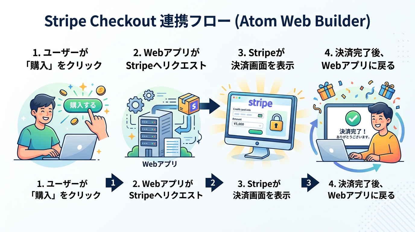 あなたが作ったアプリで「お金を受け取れる」状態にする回です。自分でゼロからクレジットカード入力画面を作るのは大変ですが、Stripe Checkout(=Stripeがまるごと用意してくれた決済ページ)を使えば、レストランで注文を取る店員さんのように、支払い処理の面倒な部分は全部Stripe側がやってくれます。あなたのアプリは「このボタンが押されたらStripeの決済ページへご案内してね」とお願いするだけです。