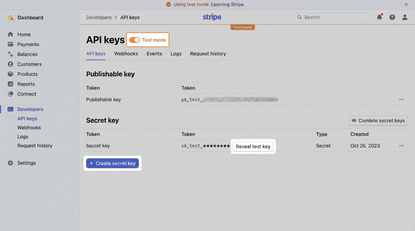 Stripeのダッシュボード右上で「テストモード」になっていることを確認し、「開発者 → APIキー」から次の2つをコピーします。