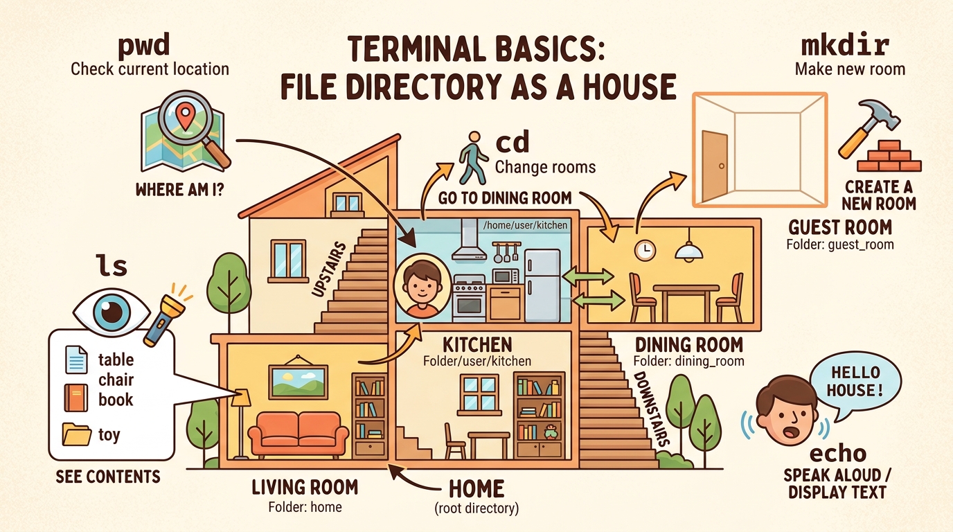 pwd— いまどこにいるか確認するls— その場所に何があるか見るcd— 別の場所に移動するmkdir— 新しいフォルダーを作るtouch— 新しいファイルを作る