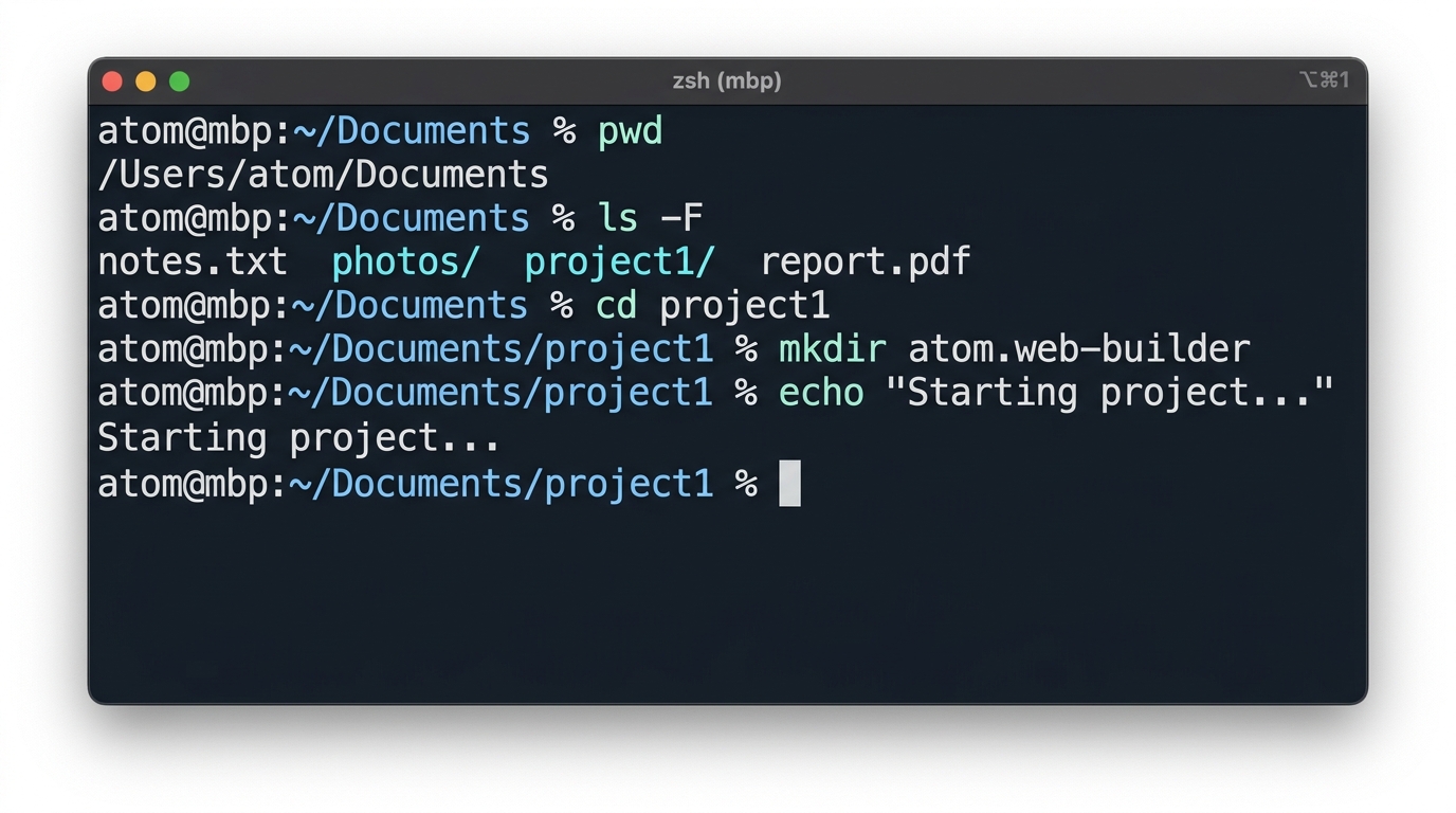すべてのステップが成功したら、ターミナルの基本操作はマスターです! この5つのコマンドは、今後のすべての Atom で使い続けます。