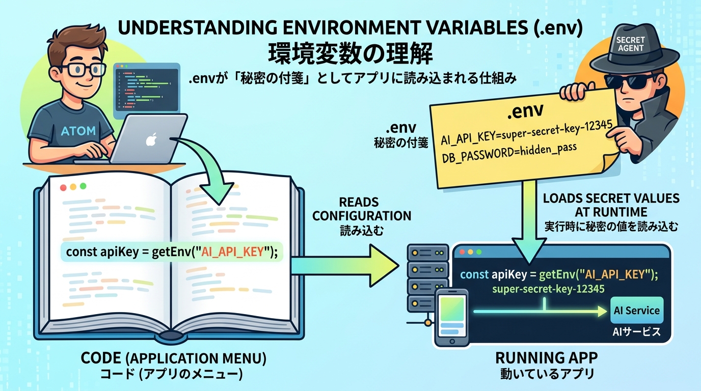 環境変数の仕組みを理解して.envを正しく書く あなたがレストランを経営しているとしましょう。お客さんには「メニュー」だけを見せますが、厨房の「秘密のレシピ」や「仕入れ先の連絡先」は見せたくありませんよね。 プログ...