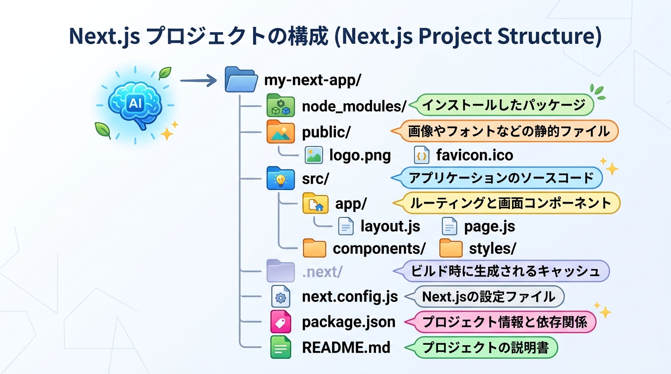 | 設定ファイル | package.json、next.config.ts、tsconfig.json | プロジェクトの動作ルールを決める |