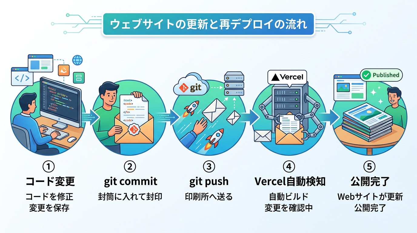 Webアプリも同じ仕組みです。コード(=アプリの設計図)を書き換えて保存・送信すると、ホスティングサービス(=インターネット上の「印刷所」)が自動的に新しいバージョンを公開してくれます。この一連の流れを「継続的デプロイ(=コードを送るたびに自動で公開される仕組み)」と呼びます。