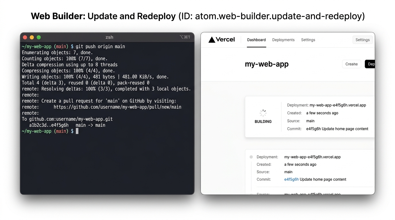 git add -A && git commit -m "メッセージ"とgit push origin mainの2つのコマンドだけ - Vercelが自動デプロイする — 送信するだけで新しいバージョンが公開される