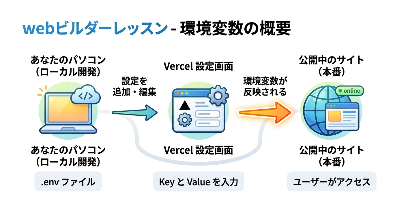 Vercelに環境変数を正しく設定する 料理をするとき、レシピ帳には「塩少々」と書いてあっても、実際に使う塩の量は家庭ごとに違いますよね。Webアプリにも同じように、コード本体とは別に「このアプリ専用の設定値」を渡...